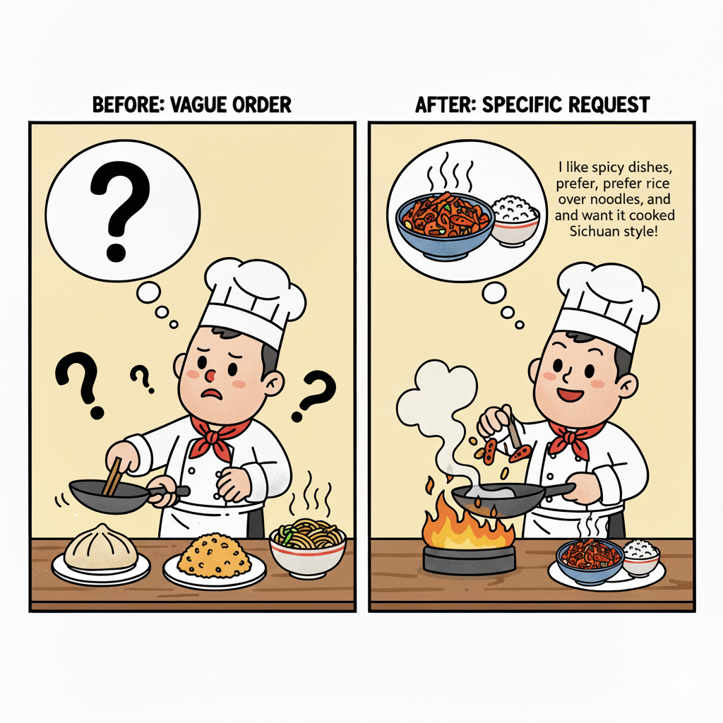 Now compare that to being specific: “I like spicy dishes, prefer rice over noodles, and want it cooked Sichuan style.” Suddenly, the chef knows exactly what to prepare. The result is far more likely to match your expectations on the first try.